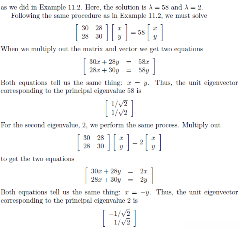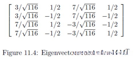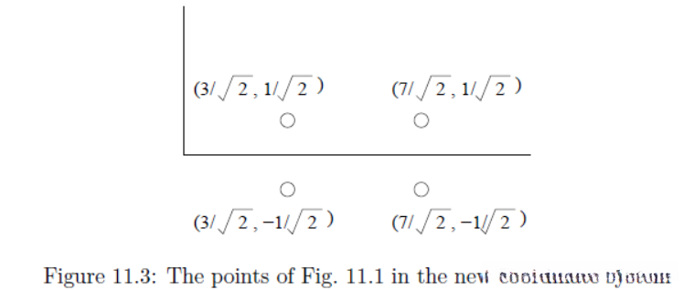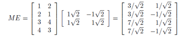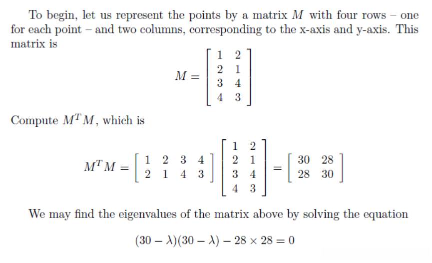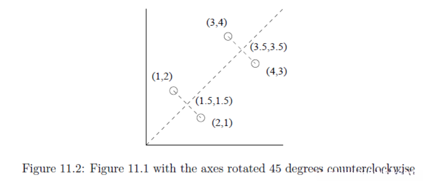 如上图,有4个二维的点,他们沿着45度点排列成一个简单图案。为了预测结果,可以最好地将这些点视为沿着45度角的轴线,并且在垂直方向上具有小的偏差。(这样就从二维变成了一维),具体处理如下:(先画出相关矩阵,然后计算MTM,然后求解该矩阵的特征值;然后根据特征值求解相应的单位特征向量)
