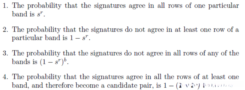 尽管用minhash将大的文档压缩成小的signature,来保存文档对的相似性,但是有特别多的文档pairs时,去寻找相似度还是不够高效的。但是如果目标是要计算每一个pair对,那么即使用同步计算,工作量也没有减少。