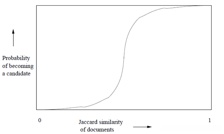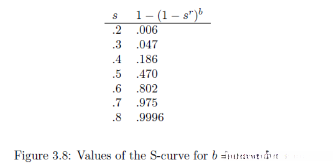*如果s=0.8,那么1-0.85就是0.627,那么增加到它的20次方,是0.00035,那么用1减去这个值,大概是0.99965.因此我们考虑两个相似度为80%的文档,那么在每一个band中,大约只有33%的机会在所有5行中达成一致成为候选pair(0.85),然而在这有20个band,20个机会成为候选。那这样看,仅仅1/3000的80%相似的对会成为FN
