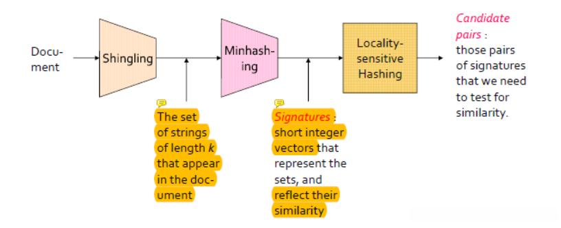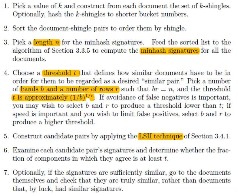data-mining的一个关键问题就是检测“相似”项目的数据 。--->如何检测(document---(shingling)-->sets--(minhashing)-->short signatures)