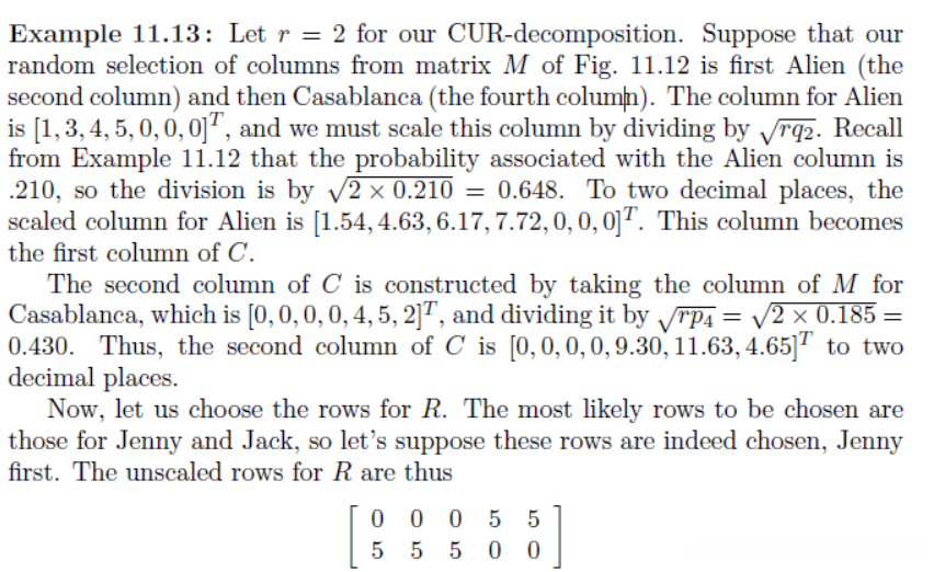 M是mn的矩阵,选择一个概念数量r.一个CUR分解,就是随机选择M的r列,形成mr的矩阵C,然后随机选择r行,形成rn的矩阵R,然后依旧有一个rr的矩阵U,使得: