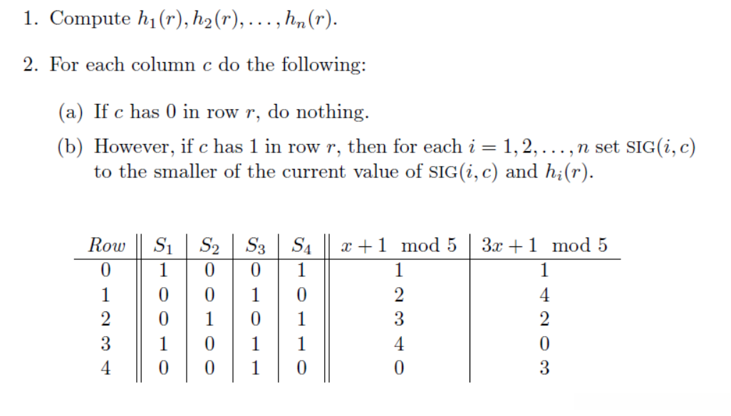 (1)原理:对矩阵进行置换行排序,对于不同的行有不同minhash值,每次选择colum值为1的最小置换序号