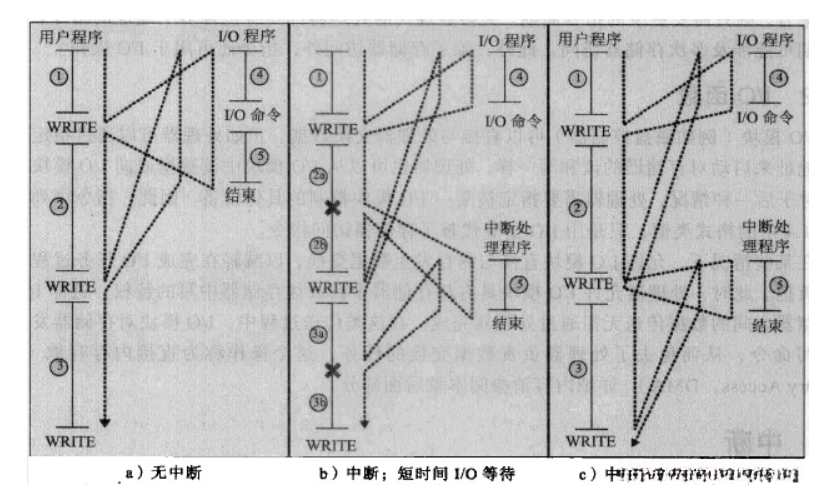- 利用中断功能,处理器可以在I/O操作的执行过程中执行其它指令:用户程序到达系统调用WRITE处,但涉及的I/O程序仅包括准备代码和真正的I/O命令。在这些为数不多的几条指令执行后,控制返回到用户程序。在这期间,外部设备忙于从计算机存储器接收数据并打印。这种I/O操作和用户程序中指令的执行是并发的