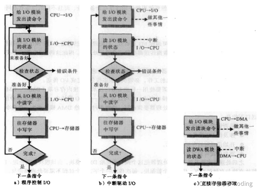 2)如果是中断驱动I/O,在给I/O模块发送I/O命令后,处理器可以继续做其它事。当I/O模块准备好与处理器交换数据时,会中断处理器并请求服务,处理器接着响应中断,完成后再恢复以前的执行过程