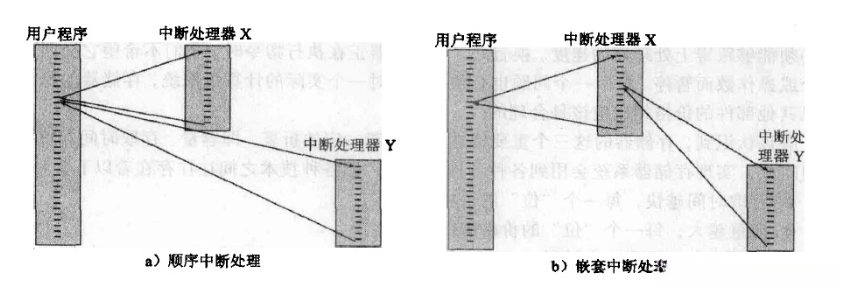 在处理一个中断的过程中,可能会发生另一个中断,处理多个中断有2种方法