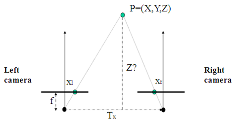 如上图,Tx为双目相机基线,f为相机焦距,这些可以通过相机标定步骤得到。而xr - xl就是视差d。