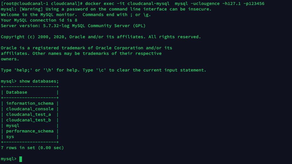 docker exec -it cloudcanal-mysql -uclougence -h127.1 -p123456