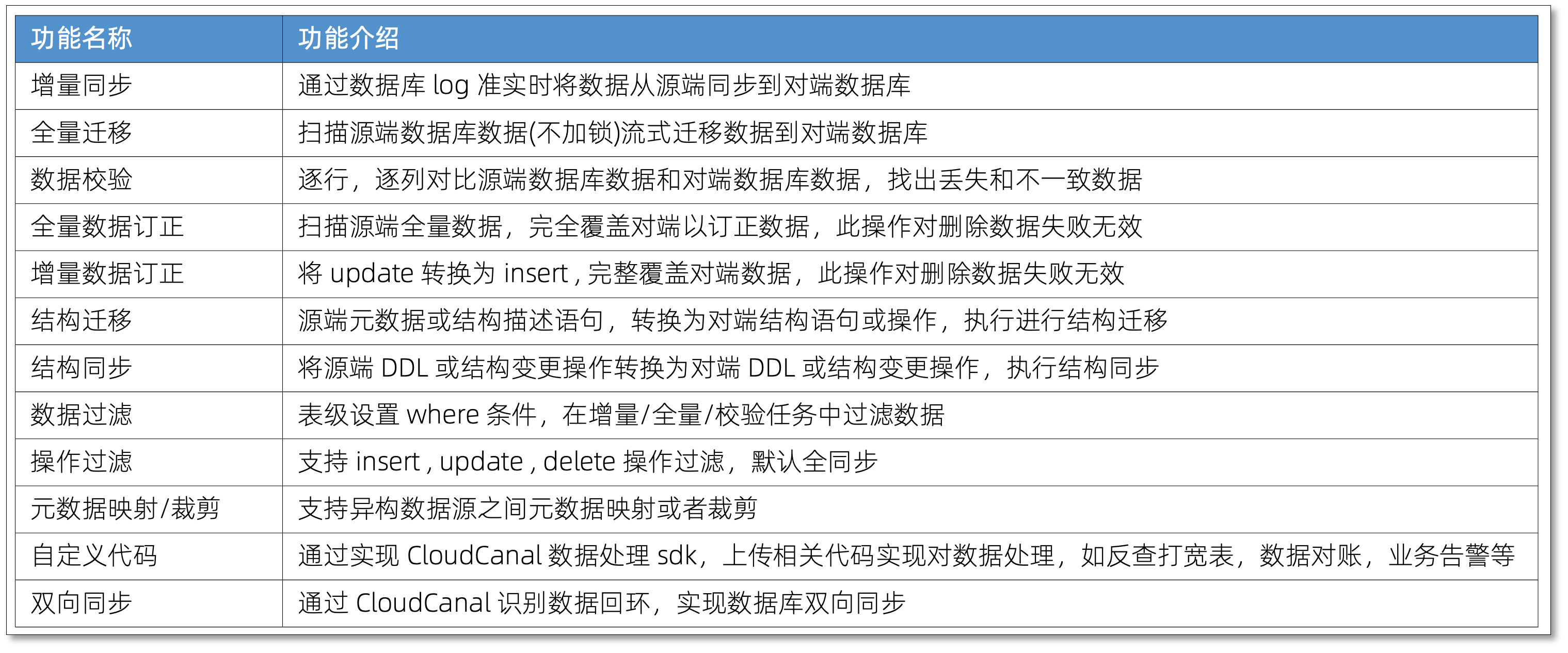 CloudCanal 具备一些对用户非常有用的核心功能,如下表所述: