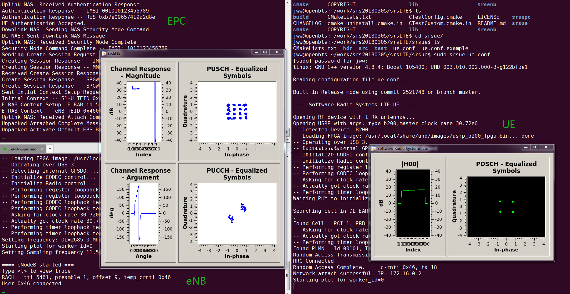 srseNB以及srsEPC可以运行在一台电脑上,也可以运行在两台不同的电脑上,但是需要保证两台机器之间的IP可达,并修改相关的配置文件;srsUE则需要运行在另一台电脑上。