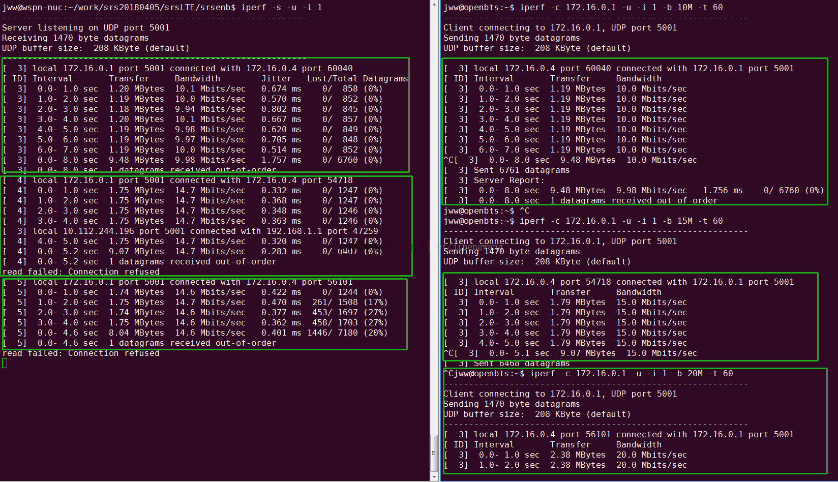 eNB侧iperf命令为: