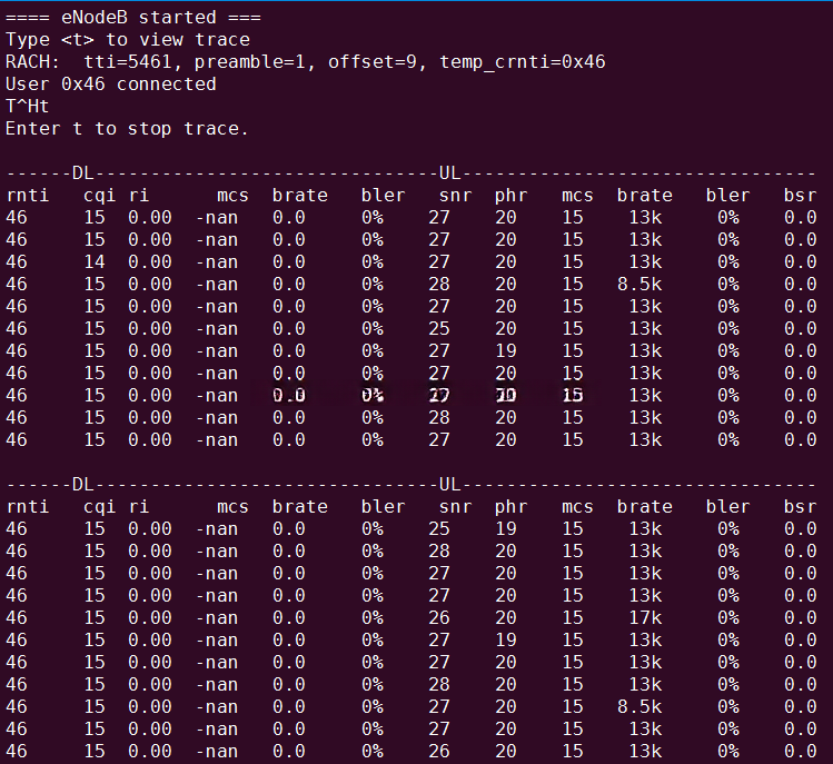 另外,在eNB及UE的运行终端中,可以输入t来实时查看snr、bler等性能指标参数,如下面两图所示: