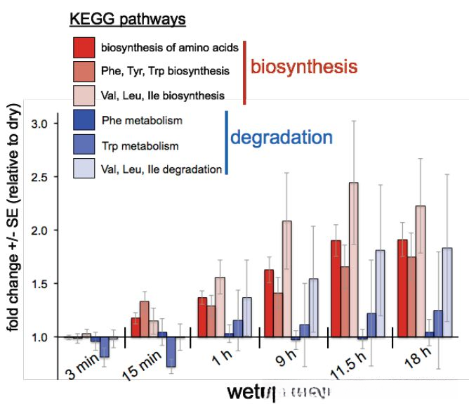 进一步验证了上述结果。研究者通过对其他学者所做生物结皮(与本研究取样地点一致)的转录本数据进行了KEGG通路数据分析,并发现大部分氨基酸合成途径均有所增加;仅有少数氨基酸的分解代谢有所变化(见图11)。此外,在代谢组和蛋白组学文献分享的基础上,在代谢物聚类分析(见图1)中cluster2的主要特征为氨基酸类物质,并且在润湿早中期阶段含量相对较高。