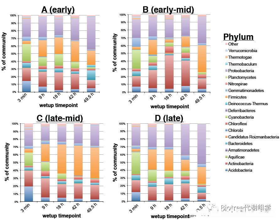 作者从组装的基因中筛选出共定性鉴定出 17 个核糖体蛋白基因(见表 1),其中 L₁₅ 核糖体蛋白群体具有最大的覆盖范围,在 466 个物种中占据主导地位;因而选择该群体作为物质标记指标进行丰度计算研究。通过分析微生物群落结构的变化发现:蓝细菌门在不同时间点上对环境条件的适应能力呈现出明显的动态特征,在最初的 3 分钟内其相对丰度从约 20-28%降至约 2%,而在随后经过约 49 小时后又回升至约 3%-4%,呈现出明显的两极化变化特征;而厚壁菌门则表现出相反的趋势,在最初的短时间内相对丰度从约 4-5%增长至约 20-39%,随后稳定下来基本未受影响;其他类群如放线菌属与变形杆菌属等则基本未受影响