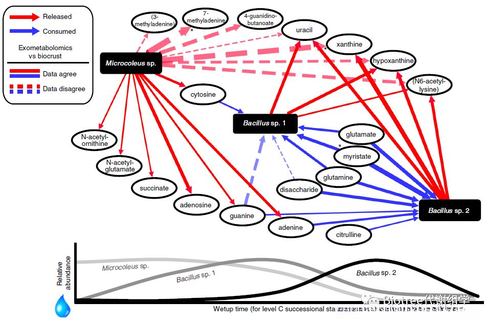 通过构建食物网的形式展示该关系可见图9,在这幅图中红色实线标记了该物质的释放途径(即被释放),而蓝色实线则代表了物质被消耗的情况(即被消耗)。其中红色实线标记的微生物与代谢物之间的相互作用模式与2016年研究结果基本一致(即存在一致性),而蓝色实线所代表的关系则显示存在差异(即不一致)。此外,在代谢组学和蛋白组学相关的文献分享中,并绘制了C阶段三种菌群丰度在不同润湿时间点的变化曲线(如图所示)。从结果来看,在润湿初期Microcoleus sp.(鞘藻属)的种群密度显著上升,并随着润湿时间延长逐渐将胞内物质释放到环境中。在此过程中,芽孢杆菌Bacillus sp. 1(芽孢杆菌1)和Bacillus sp. 2(芽孢杆菌2)开始利用环境中积累的这些物质,并且其数量也逐渐增加起来;与此同时,在这一过程中Microcoleus sp. 的种群密度却呈现下降趋势。这些观察结果表明Microcoleus sp.作为初级生产者,在生态系统中主要依赖异养微生物获取营养