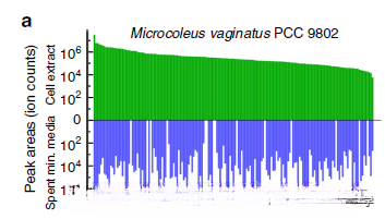 图3展示了Microcoleus vaginatus PCC 9802细胞提取液与基本培养基代谢物之间的对比分析