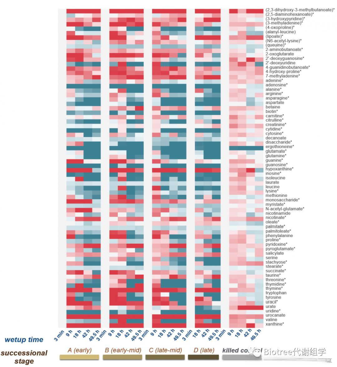为了探究这些物质的变化中哪些受生物活性影响的研究者对比了不同演替阶段、不同润湿时间和高温灭菌条件下的物质变化情况。结果显示,在至少一个阶段表现出显著差异的有53种(图6中标记为"*"),其余则可归因于非生物因素的作用。