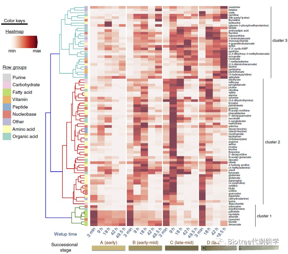 Cluster1:主要由脂肪酸组成,在不同的演替阶段中,其早期含量最高,并且随着时间推移而逐渐减少。
