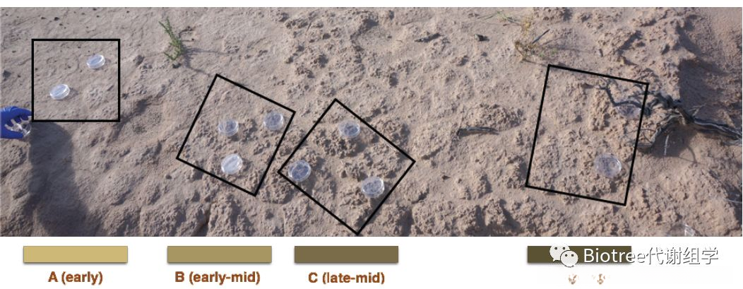 实验组 :4个生物结皮演替阶段(A-D,如图1),5个润湿时间,每组5个重复,共100个样本。