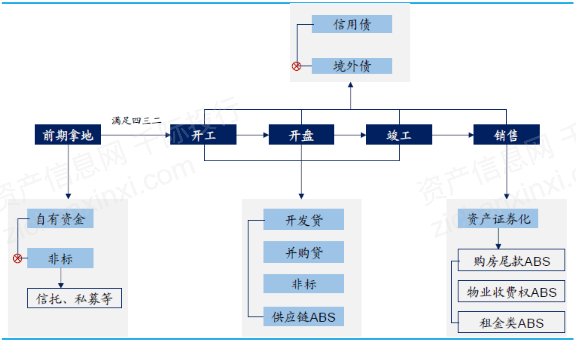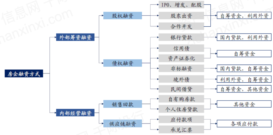 狭义上讲, 房地产融资由房地产企业及房地产项目 both 的直接与间接受融构成, 包括 property credit 和资本市场融资. 其主要渠道主要包括: 银行, 私募基金, 信托, 证券公司, 保险五个主要途径.