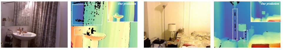 使用合成图像和真实图像的组合训练集会出现真实图像的粗略深度会破坏精细的预测的情况。