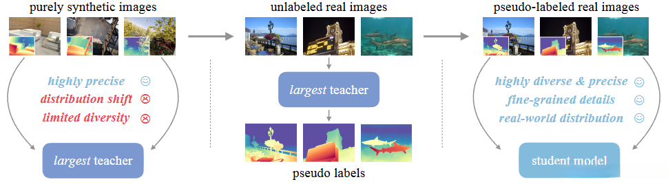高效的判别模型同样能生成非常精细的细节,关键点在于数据,训练数据应该替换为精准的合成数据。通过快打在合成图像上训练的教师模型规模,然后通过大规模的伪标注的真实图像来训练较小的学生模型。