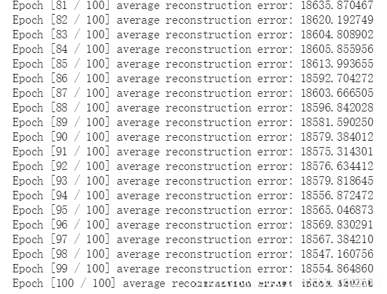 print('Epoch [%d / %d] average reconstruction error: %f' % (epoch+1, num_epochs, train_loss_avg[-1]))