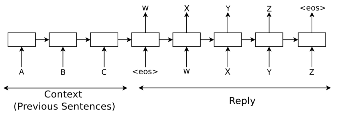 具体地说,假设我们观察谈话:第一个人说“ABC”,二人回答说:“wxyz”。我们可以用一个递归神经网络,训练映射“ABC”到“wxyz”上,当模型接收到序列符号“ “” ”时结尾: