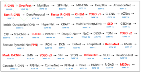 针对图像中的目标检测问题,在目标检测领域有显著贡献的方法主要包括SSD方法(由Liu[8]等学者提出)、YOLO方法(由Redmon[9,10]等学者提出)以及Dai[11]的研究团队提出的R-FCN算法)。这些方法在物体检测领域具有较高的应用价值。当前的研究重点正在转向更加高效和快速的目标检测系统。图中展示了近年来一些先进的目标检测算法实例。