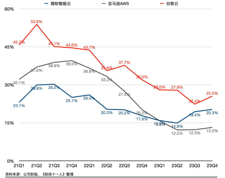 在2023财年第三季度及第四季度期间,在经历了短暂的业绩低谷后,亚马逊AWS的整体表现未能显著改善;然而,在经历了前期亏损后,谷歌云平台(GCP)实现了从亏损转盈的转变;与此同时,在人工智能领域持续领先的优势下,微软的表现格外突出,在大模型技术的支持下实现了营收增速的持续攀升。