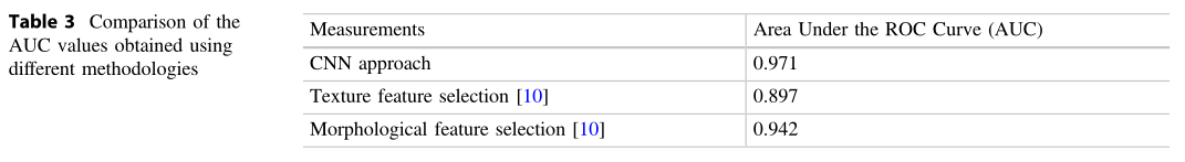此外采用了不同方法对AUC值进行了比较。如文献[10]所展示,在相同的训练数据集上采用的手动形态与纹理特征属性作为研究对象。然而这些研究并未采用基于自动特征选择的方法。研究者分别基于纹理特性和形状特征求取了相应的AUC值分别为0.897与0.942。表3总结了每种方法获得的最佳AUC值