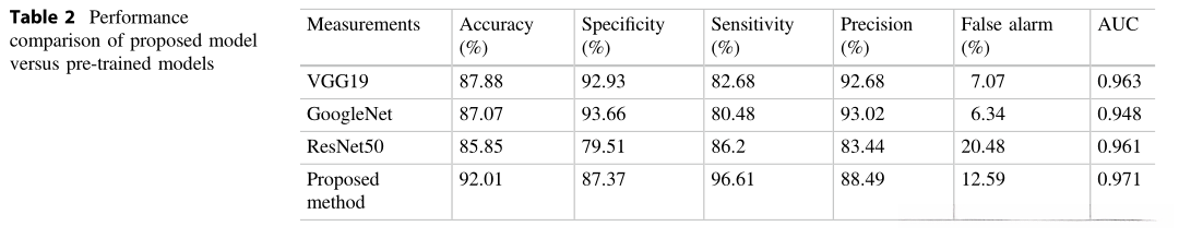 为了更全面地评估我们提出的方法的效果, 我们采用了已知的一些预训练模型, 并在表2中进行了结果对比。这些预先训练好的模型是在大规模数据集上经过大量学习得到的, 虽然所用图像与之前的网络不同, 但它们具有类似的特征, 通过简单的微调方法可以在新的数据集上迁移这些预先训练好的模型。