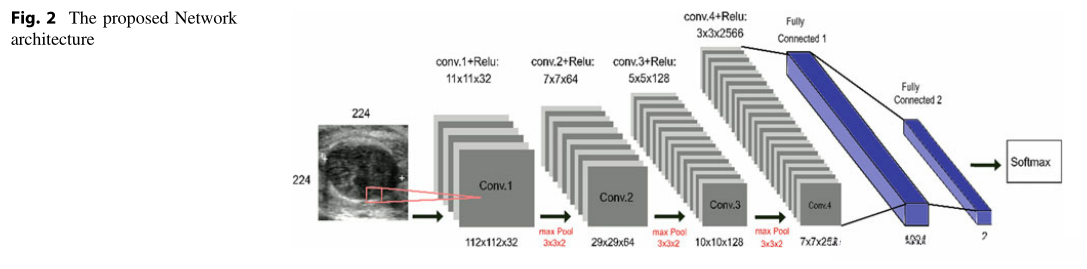 我们开发了US肿瘤分类系统的五个核心环节:首先进行图像预处理步骤;然后通过深度卷积层实现自动特征提取机制;接着基于Softmax函数进行图像分类;随后实施超参数优化过程及正则化措施;并最终完成评估过程。