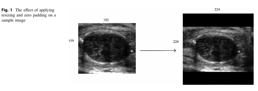 在大多数神经网络架构中,默认假设所有输入图像具有相同的尺寸[11]。基于这一前提,在调整大小时必须以保持原始比例为基础进行尺寸选择。本研究开发了一种算法用于确定原始图像的最佳尺寸,并通过在角落补充零值来构建方阵。通过这种操作方式,在本研究中将图像调整至224×224像素(如图1所示),同时保持了原有的比例关系。此外采用归一化处理措施(Zero Normalization)旨在使数据均值为零、方差为一。这样梯度的变化更为均匀,并且能够有效加速学习过程[12]。