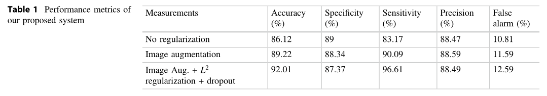 我们评估了所提出的架构的性能,应用了各种超参数调整和正则化技术。数据集被分割以执行五折交叉验证,其中80%的数据用于训练,20%用于测试。重复这个过程五次,每次选择一个不同的集合作为测试集合,我们保证所有的子集都用于训练和测试。图像增强是通过随机翻转和旋转图像并将这些增强的图像添加到训练集中来应用的。批量大小被设置为64,并且0.001的固定学习速率被应用于网络。为了进一步避免过拟合,在最后一个完全连接的层之前添加一个概率为0.5的Dropout层,并将