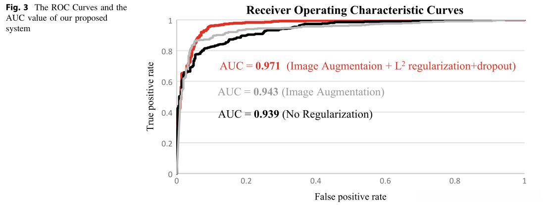表1列出了应用图像增强与正则化前后系统的性能指标对比。由于所给数据集规模较小,在测试过程中容易出现过拟合现象。通过实施图像增强、优化超参数配置以及合理应用正则化手段,在准确率和AUC指标方面均实现了显著提升(如图3所示)。