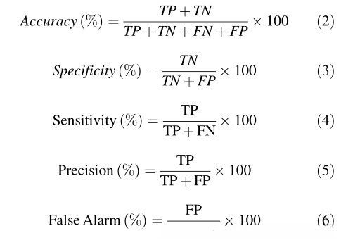 将L2正则化系数设定为0.01,在本研究中将其视为模型正则化的关键参数。研究中采用的评估指标包括准确率(Eq. 2)、特异性(Eq. 3)、灵敏度(Eq. 4)、精度(Eq. 5)、误报率(Eq. 6)以及ROC曲线下面积(AUC)。这些指标共同构成了模型性能评估的标准体系。