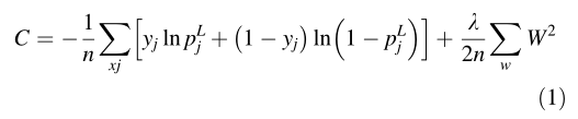 在等式1中,第一项代表交叉熵损失函数,在此框架中n代表训练数据集的规模;y代表预期输出结果;p则是各个类别对应的概率分布;此外,在损失函数的计算中还包含了正则化项;具体来说,这一项通过λ来控制正则化强度参数;