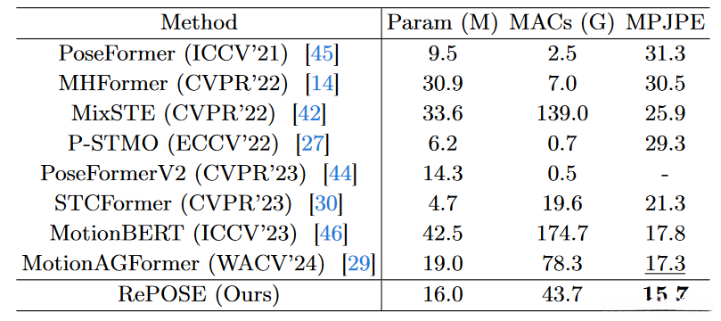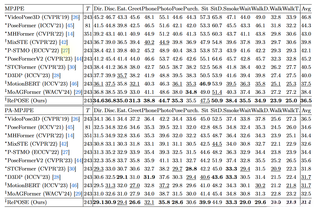 在本文中,我们介绍了 RePOSE,这是一种旨在提高视频序列中 3D 姿态估计准确性的方法,特别是在身体部位被遮挡或遮挡的情况下。与主要依赖于深度信息的传统方法不同,当身体部位不可见时,深度信息可能会失效,RePOSE 采用了一种以身体部位的相对定位为中心的创新策略。这种方法不仅在管理遮挡方面表现出卓越的功效,而且还具有简单的实现方式,需要最少的代码调整。我们的综合实验验证了 RePOSE 的性能优于现有的最先进技术,特别是在有障碍物的场景中。这些结果强调了 RePOSE 的功效及其在推进 3D 姿态估计方面的巨大潜力,特别是在遮挡和部分可见性常见的实际环境中。此外,其集成的简单性使 RePOSE 成为旨在提高姿态估计精度的研究人员可行且有效的解决方案。