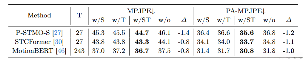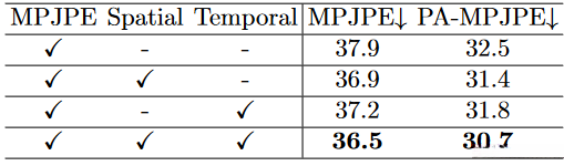 在身体部位被遮挡的情况下,标准模型通常难以准确确定关节的深度定位,从而导致空间不一致。通过整合我们的空间深度排序损失,我们引导估计与实际空间配置更紧密地结合,从而向模型提供反馈,以改进训练并增强模糊身体部位或关节的区分。特别是在自遮挡场景中,传统方法可能会错误地关联身体关节,例如由于位置重叠而将手误认为肘部。当仅使用 MPJPE 作为损失函数时,这种类型的错误可能会被忽视,但当人体骨骼可视化时,这种错误就会变得明显。我们提出的空间深度排序损失函数通过加强框架内的关节间关系,有效地防止这些错误并确保更准确地表示人体结构。
