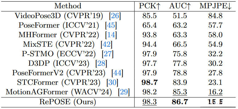 为了应对这一挑战,我们提出了 RePOSE,这是一种专门为提高遮挡场景中 3D HPE 的准确性而设计的新颖方法。 RePOSE 通过引入时空关系深度一致性来规避绝对深度依赖的局限性。我们的方法强调使用空间和时间域中的相对深度一致性损失来正确排序被遮挡的关键点,而不是仅仅依赖于绝对深度值。这种方法的转变使我们的方法能够稳健地处理遮挡,提供更准确、更可靠的姿态估计,如图 e 所示。此外,时空关系深度一致性的简单性,只需几行代码即可实现,使其成为现实应用程序实用且有效的解决方案。