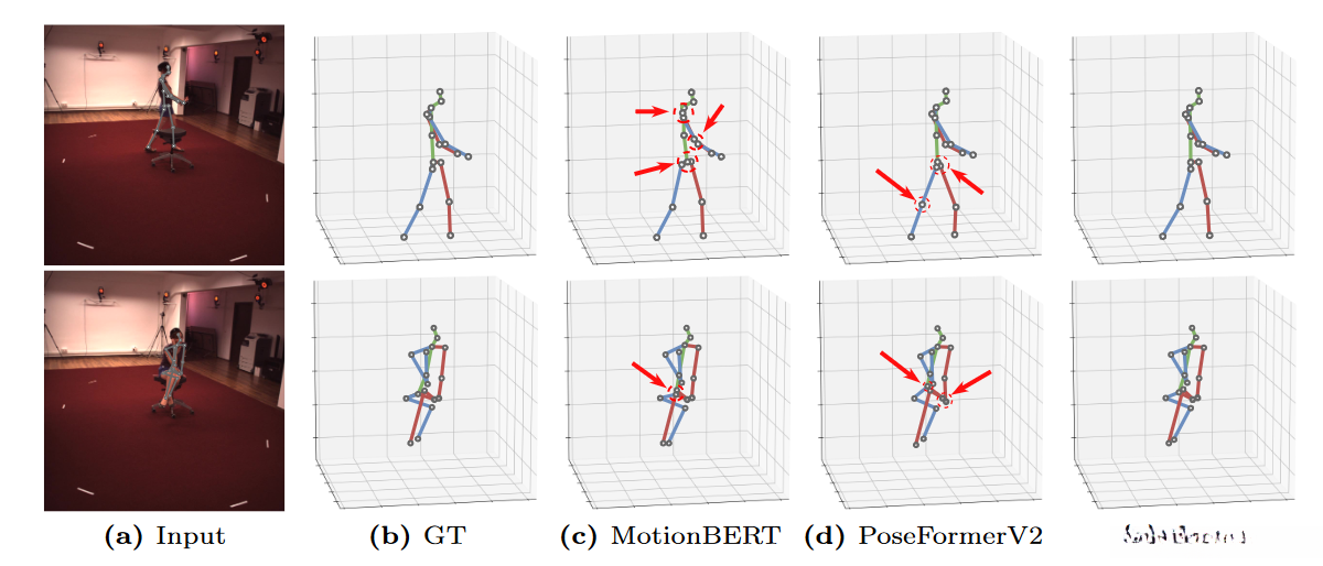 2D 到 3D 提升方法的最新进展通常采用 Transformer 架构 ,该架构在捕获全局信息和建模顺序数据方面表现出了卓越的能力。这些方法通常涉及使用定制算法将检测到的 2D 姿势转换为 3D 空间 。然而,这个过程本质上面临着多对一的映射挑战,其中多个不同的 3D 姿势可以对应于单个 2D 投影,特别是在遮挡场景下,如图 c 和 d 所示。在这种情况下,关键身体关节的遮挡会导致 2D 姿态估计的准确性降低,从而在 3D 重建过程中产生模糊性。此外,在模型训练过程中依赖这些不可靠的遮挡信号会导致学习路径模糊且不确定。这种限制主要源于该方法对绝对深度信号的依赖,在遮挡条件下会失去可靠性,从而损害 3D 位姿估计的整体精度。