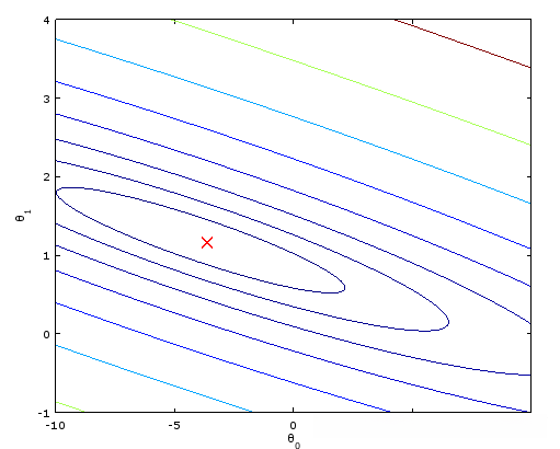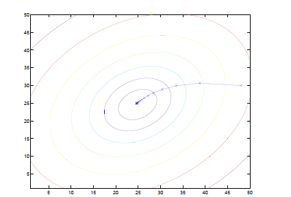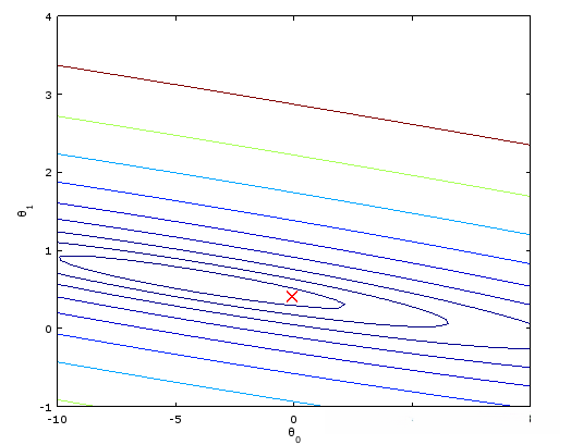 从直观上来看,在二维空间中绘制出不同cost value对应的曲线即为等高线;横轴和纵轴分别对应θ₁和θ₂这两个参数;而梯度下降的过程就是每次沿垂直于等高线方向移动一小步朝向更低数值的位置(位于图中心)。显然在选择步长时需要格外小心,在某些情况下如果步伐过大可能会导致错误的结果(例如跨越一步后反而到达更高数值的位置)。