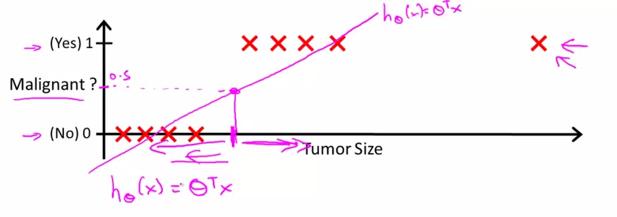 离群点会对结果产生显著影响,在图中(例如,在h(x) > 0.5时我们将其预测为y=1)可以看到这一现象:一个异常值导致拟合直线发生显著变化,并将许多原本应正确分类的数据点错误归类。值得注意的是,在在线课程中仅提到了这一原因(尽管还有更多因素需要考虑),还有一个问题是:从直观上看h(x)取值超出[0,1]区间是没有实际意义的——因为已知y只能取到{0,1}中的值。(那h(x)在[0,1]区间内又代表什么呢?确实值得深思啊)