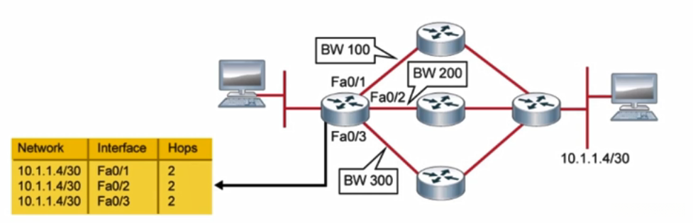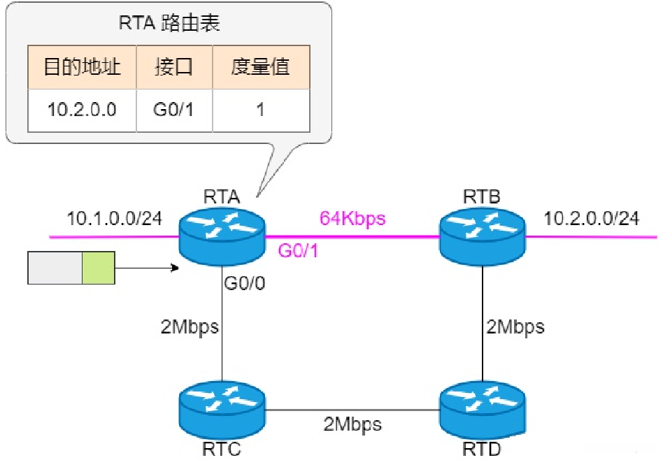 - 相对简单的做法是基于跳数来计算度量值,并可能导致非最佳路径。