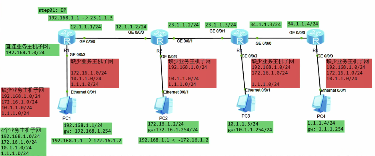 R1有两个非直连网络,通过RIP配置非直连路由。