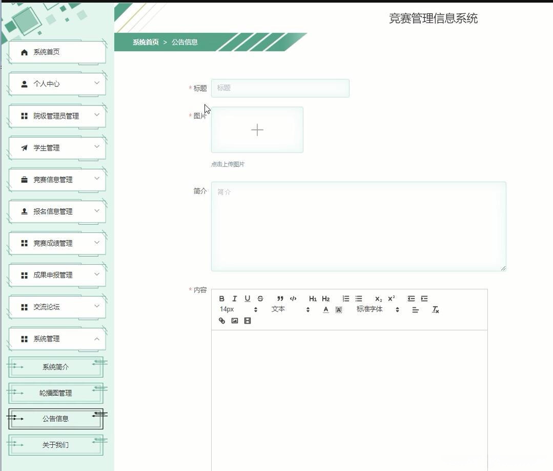 1.竞赛审核:竞赛审核页面(竞赛编号、竞赛标题、竞赛内容信息、竞赛作品收集方式)——审核通过直接发布、审核不通过(给出原因)
