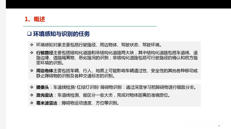 第三章自动驾驶汽车环境感知 第一节车载传感器介绍 1.1车载传感器介绍 1.2可见光相机 1.3激光雷达 1.4毫米波雷达 1.5超声波雷达 1.6惯性导航