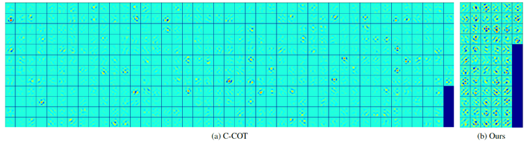 通过可视化发现,C-COT很多滤波器能量很小,对于结果其实是没什么贡献,因此提出方法从 D个滤波器中选择贡献最大的C个 ,进行降维: