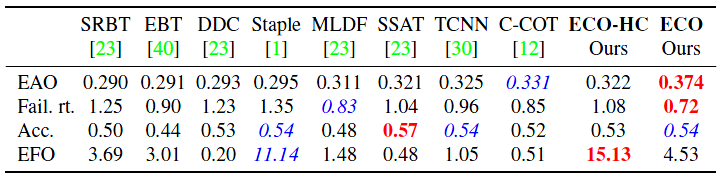 EAO(Expected average overlap) :跟踪框准确率第一,优化的特征降维 和 多样性样本 起了重要作用;