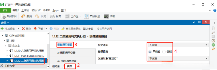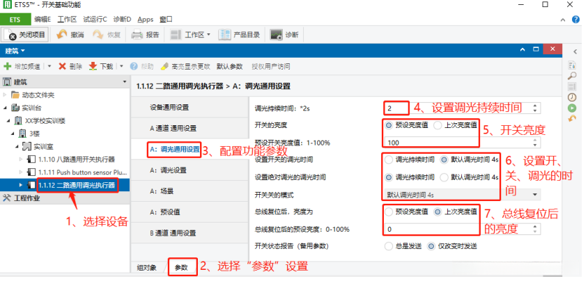 5.配置2路调光模块 首先选择“2路调光模块”-》“参数”-》“通用设置
